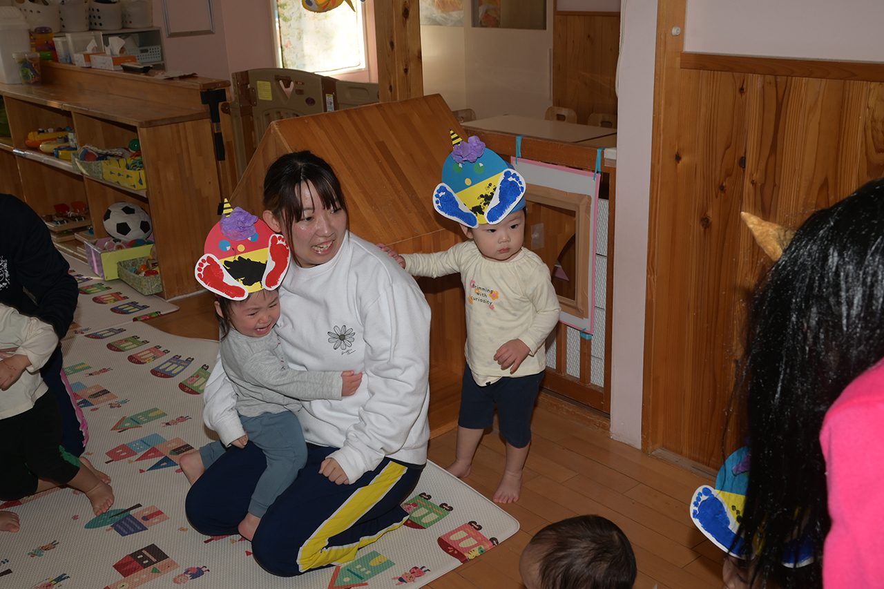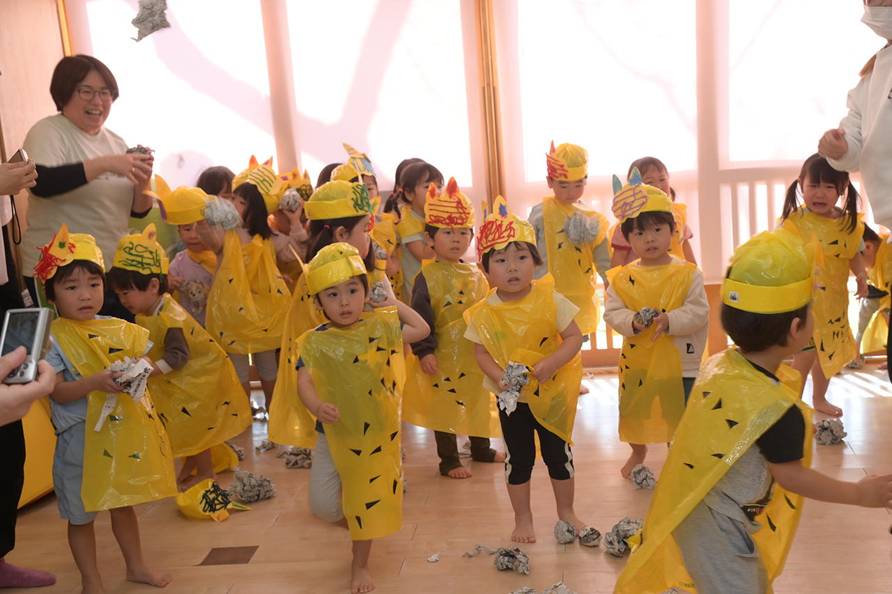 節分で保育園に鬼がやってきました。自分の中にある“泣き虫おに”や“意地悪おに”をやっつけるために、子どもたちはいろんな作戦を考えていました。いざ鬼がやってくると怖くて逃げていましたが、「鬼は~、外~!」とみんなで作った新聞紙の豆を鬼に投げました。4歳児さんと5歳児さんは鬼をやっつけるためにいろんな作戦を考えていました。怖い気持ちもあったけど、大好きな友だちや先生を助けるために勇気を出して鬼に立ち向かいました。みんなで力を合わせて鬼を追い払い、自分の中の“おに”もやっつけることができました。