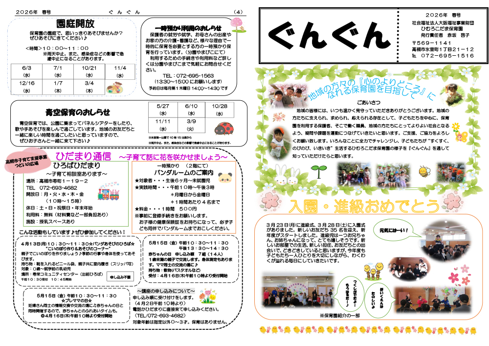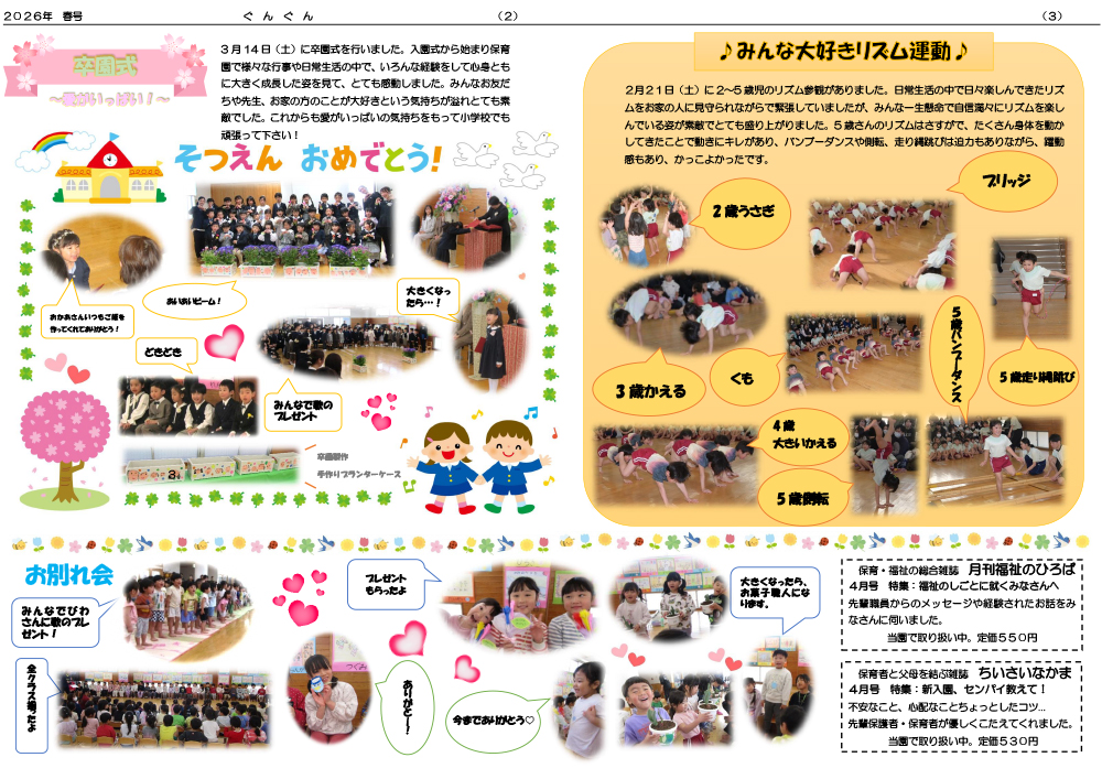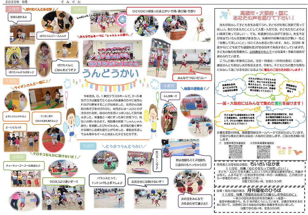- 児童にとっていろんな体験ができるように工夫をし、また友だち同士のふれ合いを通して、からだや心の刺激・育ちを、保育園全体の職員で見守っていきます。
