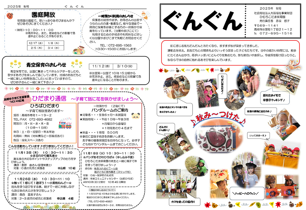 - 一時預かり(きりんぐみ)では、1日の手人を7~10名とし、その中で児童ひとりひとりの心身の状態や保育場面への適応状況・年齢などを考慮して受け入れを行い、年間行事(交通安全教室・遠足・クリスマス会・節分など)への参加や通常保育との交流もはかっています。